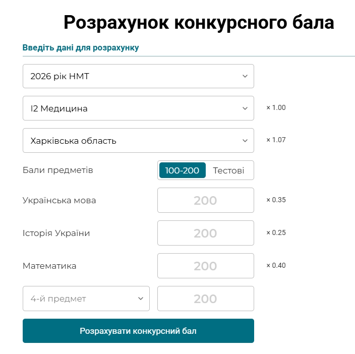 Калькулятор конкурсного бала для вступу 2025 року